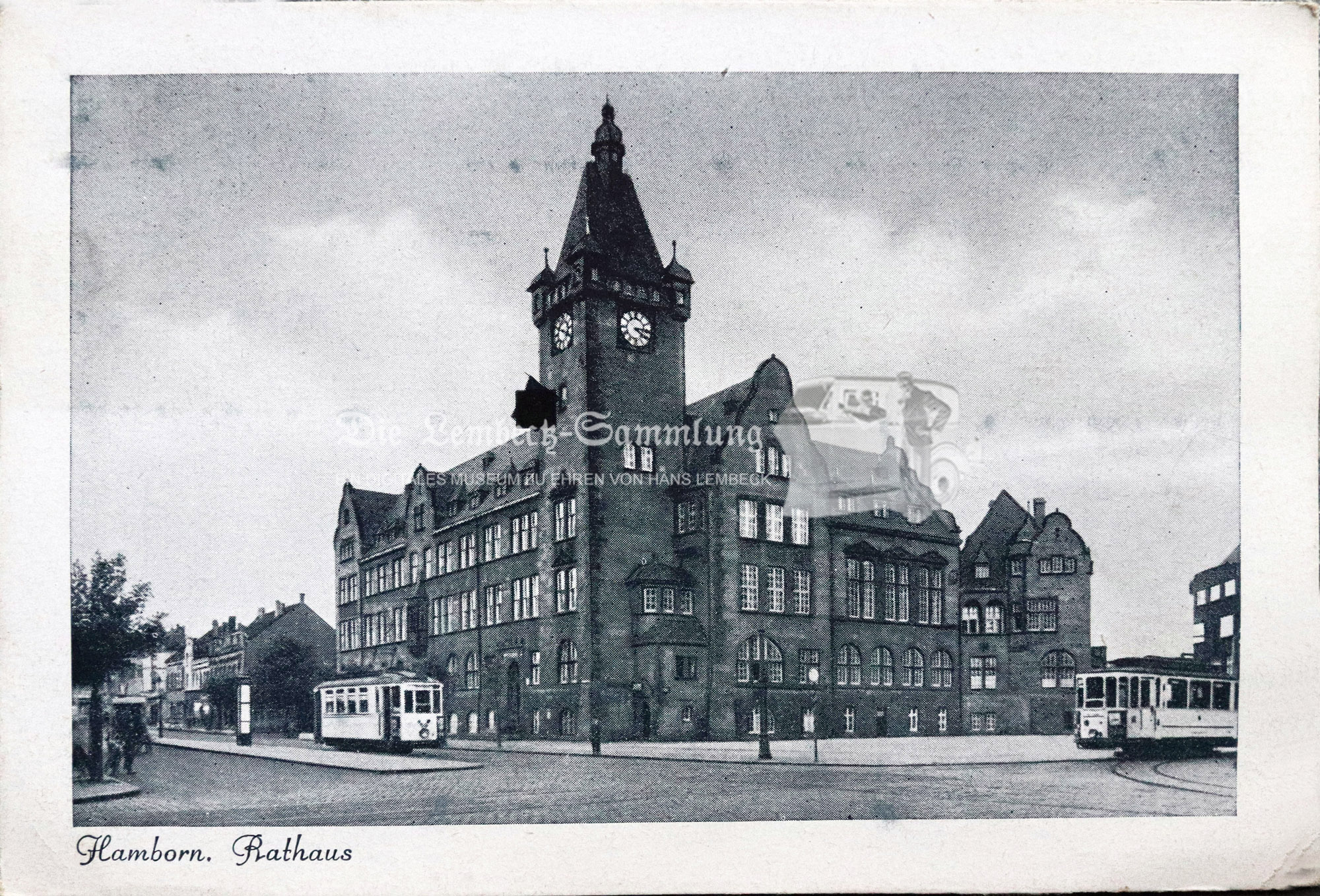 Ansichtskarte Hamborn Rathaus, Blickrichtung von Nord (Platz Amtsgericht Duisburg-Hamborn), im Vordergrund 2 Straßenbahnen auf Duisburger Straße sowie auf Rathausstraße. Datum k.A.