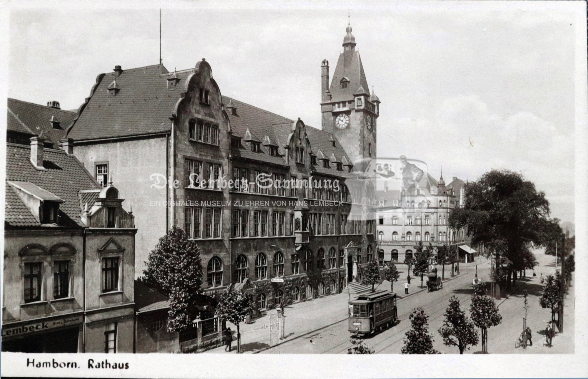 Ansichtskarte Hamborn Rathaus, Blick von Osten über die Duisburger Straße. Im Vordergrund eine Straßenbahn, Fußgänger, eine Pferde-Kutsche. Links am Bildrand das Haus mit der Buchhandlung Lembeck (Außenschild teils zu erkennen). Datum: k.A.