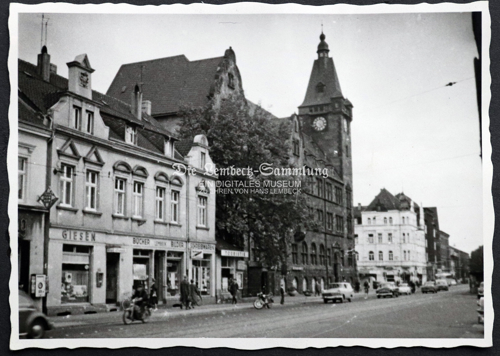 Fotografie Buchhandlung Lembeck circa. 1946. Neben den ursprünglichen 2 Schaufenstern erkennt man nun rechts (unter Schild Schreibwaren) die Erweiterung des Ladenlokals. Rechts neben der Buchhandlung zu sehen der Verkaufsanbau mit der Beschriftung „Touristik“. Links im Bild das Ladenlokal Giesen, daneben links vermutlich ein Verkaufsautomat an der Hauswand. Auf der Straße neben Fußgängern Mopedfahrer und einige PKW-Limousinen, u.a. ganz links am Bildrand ein VW Käfer.