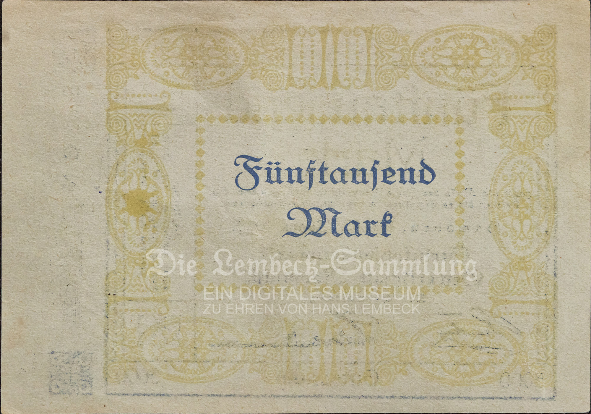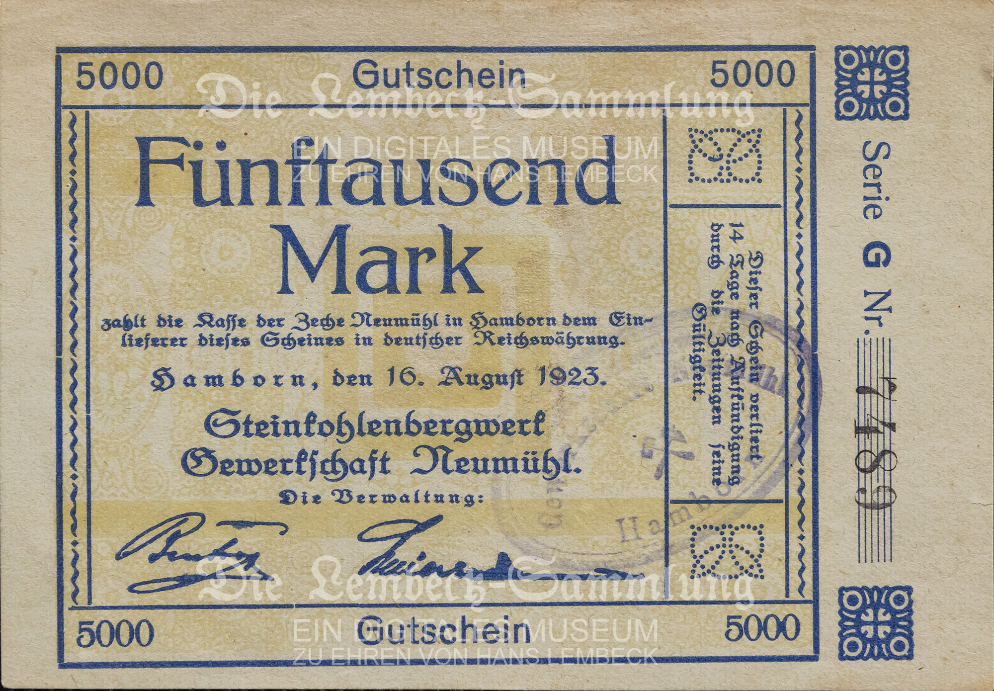 Fünftausend Mark zahlt die Kasse der Zeche Neumühl in Hamborn dem Einlieferer dieses Scheines in deutscher Reichswährung. Hamborn, den 16. August 1923. Steinkohlenbergwerk Gewerkschaft Neumühl. Die Verwaltung. Dieser Schein verliert 14 Tage nach Aufkündigung durch die Zeitungen seine Gültigkeit.